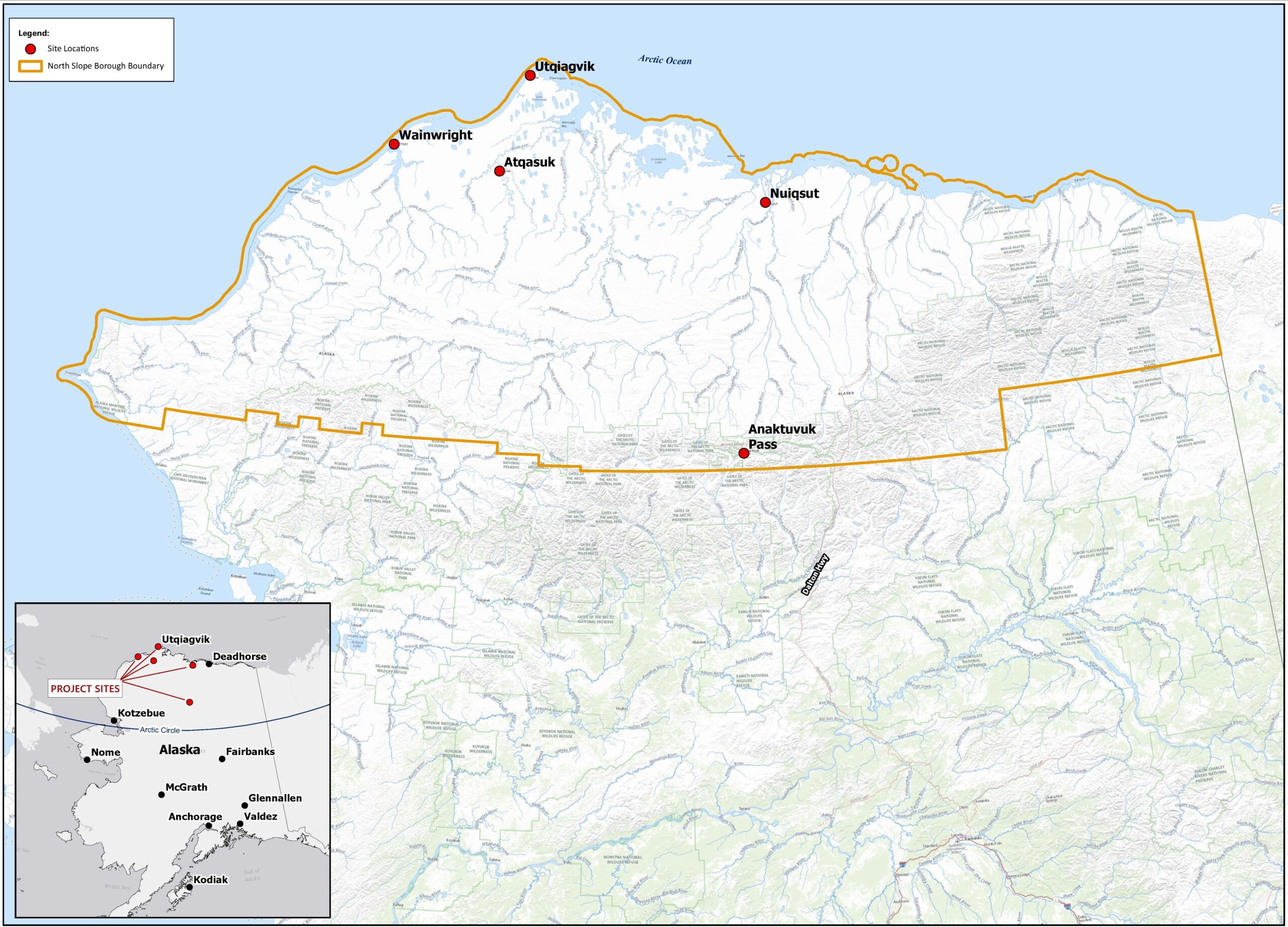 The North Slope Borough (NSB) Area Wide Air Quality (AQ) Study is a three-year study funded by the State of Alaska with the objective of collecting diverse baseline air quality data from five select villages on the North Slope of Alaska to determine the impact of the air quality on the health of the villages’ residents.This study began in October of 2023 and is currently scheduled to run through the end of 2025. The five villages participating in this study are Anaktuvuk Pass (AKP), Atqasuk (ATQ), Nuiqsut (NUI), Utqiagvik (BRW), and Wainwright (AIN). A map of where these villages are located on the North Slope can be seen in Figure 1 below.