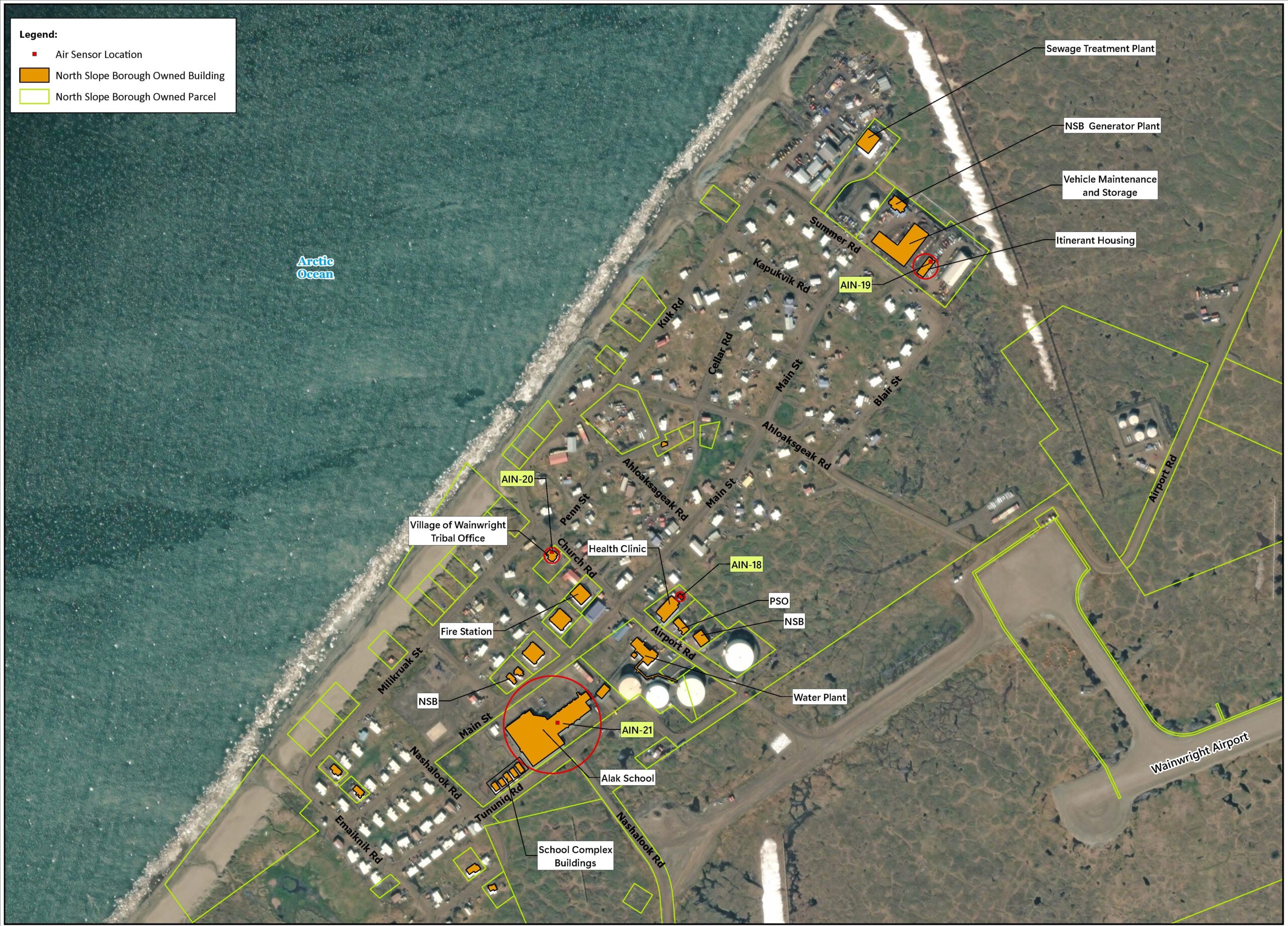 Wainwright (AIN) is a village on the North Slope of Alaska with a population of 625. It is located on the Chukchi Sea at an elevation of 33 feet. There are four locations where data are being collected. Further information is provided in Table 7 below and Figure 6 to the right.
